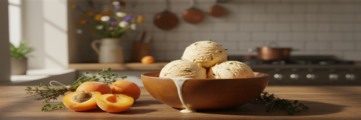 Flavour Profile: Thyme, a fragrant herb often associated with savoury dishes, brings an unexpected and curious twist to your homemade apricot ice cream.